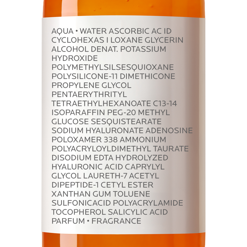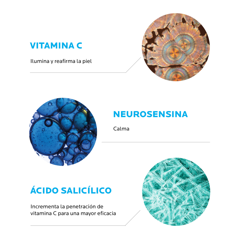 - Neurosensina, un péptido con propiedades calmantes que combate los mecanismos de irritación de la piel. Su papel es muy importante, ya que, al ser antiinflamatorio, calma la piel y asegura la tolerancia del producto. De esta forma y junto con el ácido salicílico, la neurosensina consigue que la vitamina C no sea irritante para el tejido cutáneo, sobre todo en pieles sensibles.