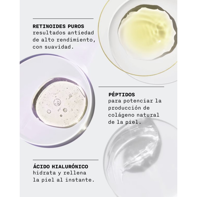 Formulado con un potente retinoide, péptidos y ácido hialurónico, este sérum penetra profundamente en la piel para reparar, rellenar y mejorar la luminosidad. Es adecuado para todo tipo de piel y ha sido desarrollado y testado por dermatólogos para asegurar su eficacia y seguridad.