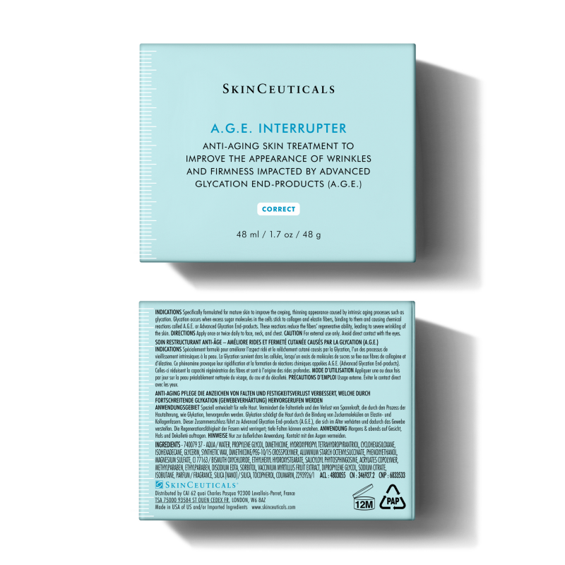 A.G.E. Interrupter es una crema antiedad formulada para combatir los signos del envejecimiento intrínseco asociados a la glicación: pérdida de firmeza, arrugas profundas, piel frágil y falta de elasticidad. Refuerza la barrera cutánea, mejora la densidad y aporta una textura más uniforme.