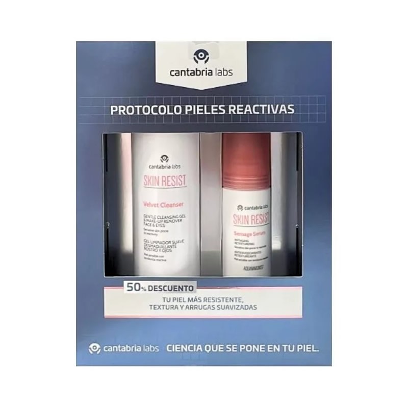 Un pack dermocosmético formulado por Cantabria Labs para el cuidado integral de pieles sensibles, reactivas o con tendencia a la irritación. Incluye dos productos clave: Skin Resist Velvet Cleanser (200 ml) y Skin Resist Sensage Serum (30 ml), que trabajan en sinergia para limpiar suavemente, calmar y fortalecer la piel frente a agresores externos.